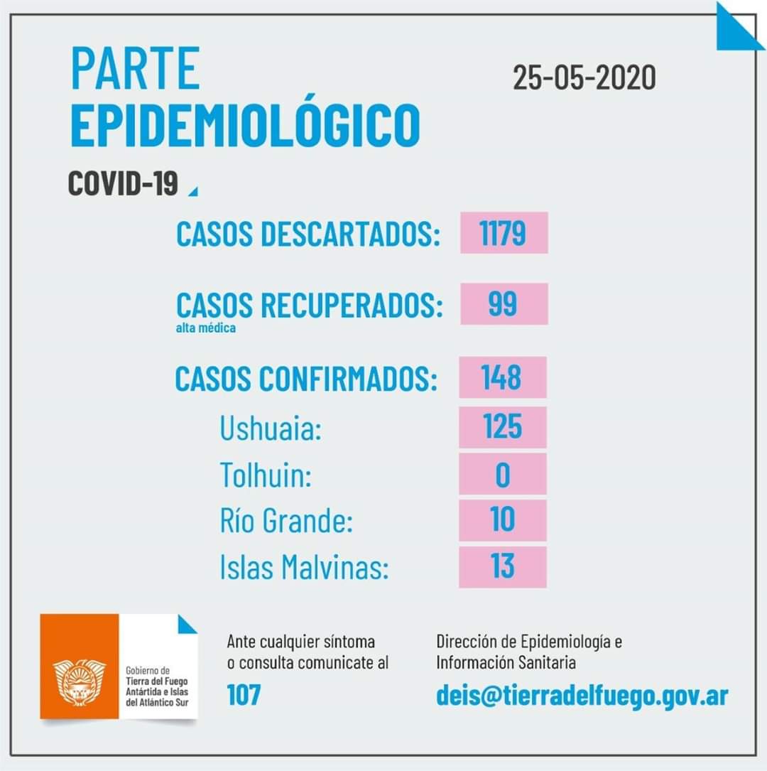 Totalidad de casos confirmados en Tierra del Fuego a la fecha 148 (*). No se registran nuevos casos en la provincia.