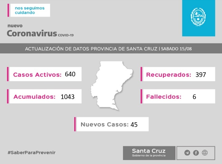 Santa Cruz registra un total de 1043 casos positivos desde el inicio de la pandemia: 640 activos, 397 pacientes recibieron el alta y 6 fallecieron (5 Río Gallegos, 1 San Julián).