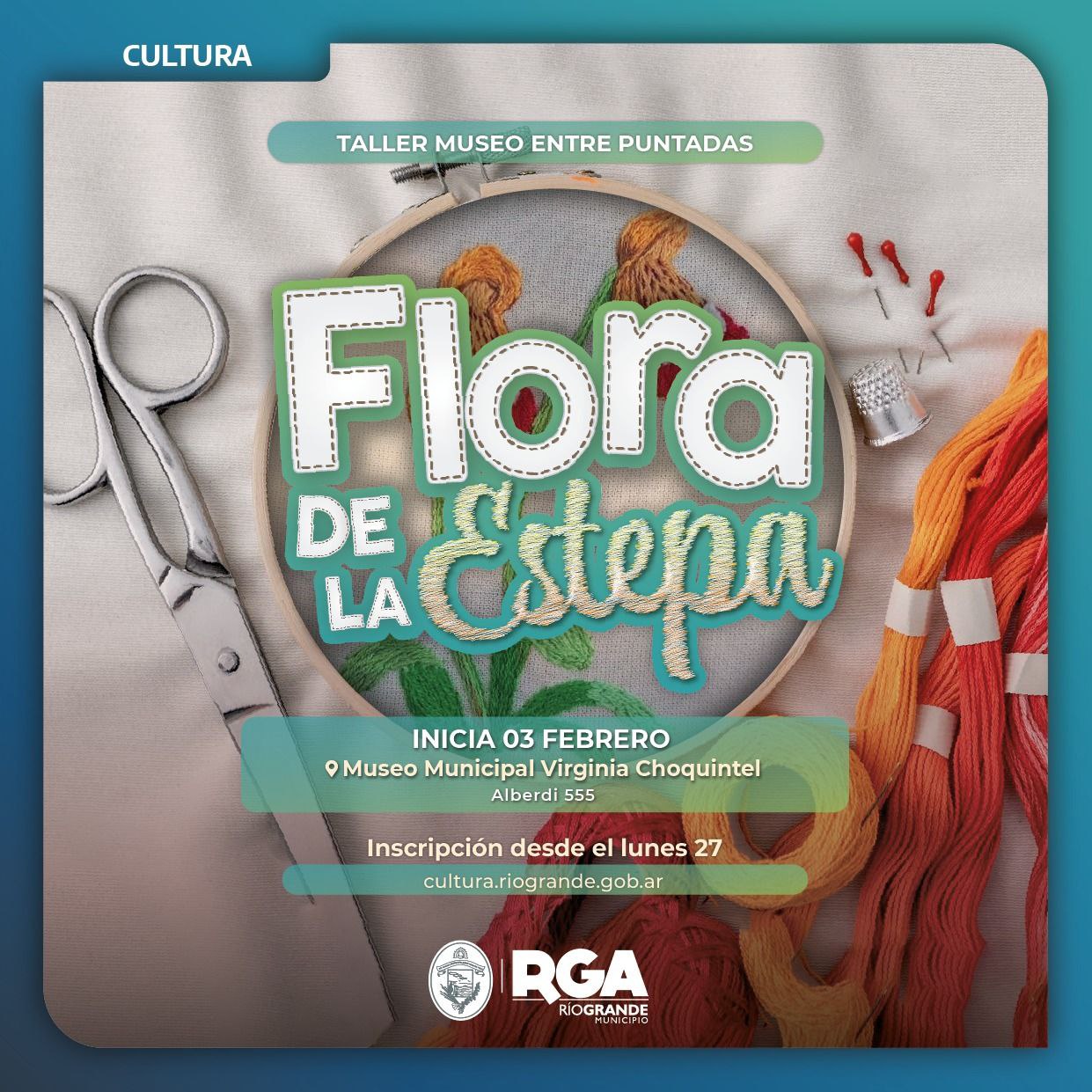 El Municipio de Río Grande, a través de la Subsecretaria de Cultura, invita a la comunidad a participar del taller creativo «Museo entre puntadas, flora de la estepa». Las inscripciones comienzan este lunes 27 de enero a través de la página web oficial: cultura.riogrande.gob.ar.
