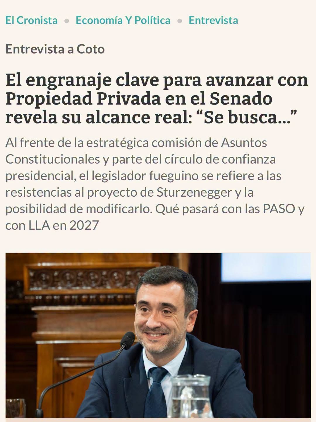 Desde su rol como Presidente de la Comisión de Asuntos Constitucionales en el Senado de la Nación, Agustín Pedro Coto se posiciona como un engranaje clave que combina la confianza con el círculo presidencial con un perfil dialoguista dentro del Senado para darle impulso a las nuevas reformas para transformar la Argentina.