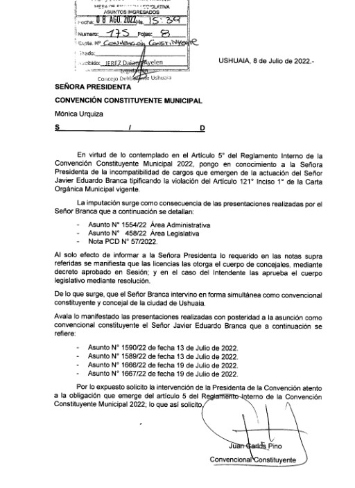 Juan Carlos Pino, de esta manera, solicitó mediante nota que se genere una intervención de la Presidenta de la Convención de acuerdo a la obligación que emerge del artículo 5 del Reglamento interno de la Convención Constituyente Municipal 2022 en cuanto a las actuaciones posteriores a la asunción como Convencional Constituyente de Javier Branca.