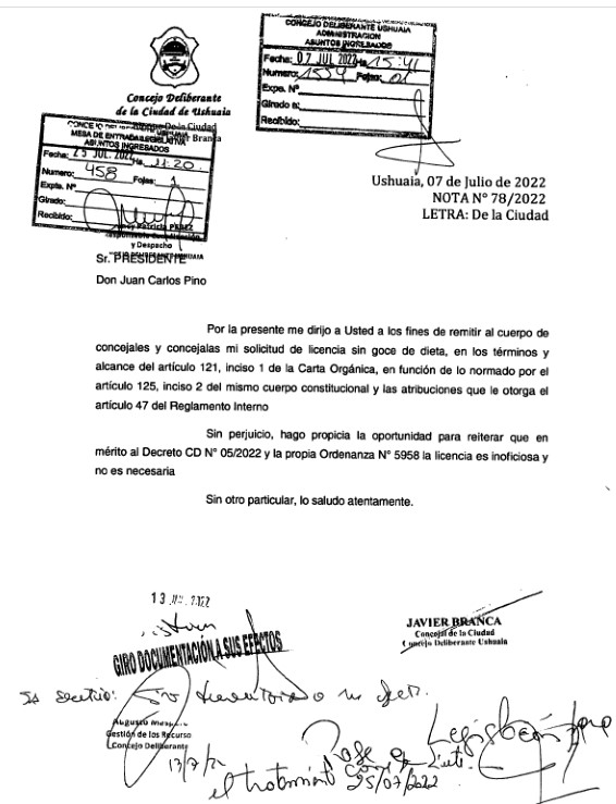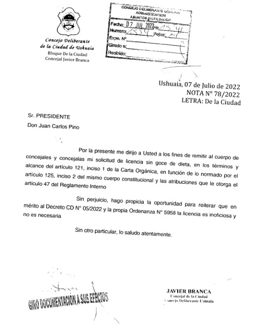 Javier Branca emitió una nota hacia el presidente del Concejo Deliberante de la ciudad de Ushuaia, Juan Carlos Pino, el 4 de Julio donde comunica su licencia a la posición de Concejal a partir de la entrada en funcionamiento de la Convención Constituyente y hasta tanto dure el desarrollo de la misma. En el mismo documento hace referencia a que esta licencia es tanto inoficiosa e innecesaria; Documentación que volvió a ser reiterada el 7 de Julio por Branca mismo.