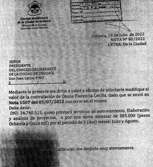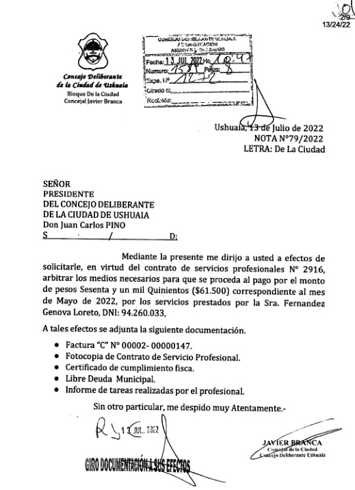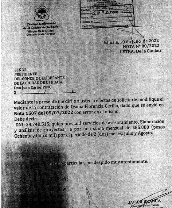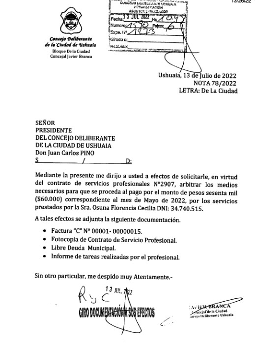 Sin embargo, Javier Branca solicitó nuevamente como Concejal el 13 de Julio y el 19 de Julio que se arbitren los medios para el pago de servicios a profesionales desde el Concejo Deliberante correspondientes al mes de Mayo, Julio y Agosto, en clara oposición a su licencia como Concejal y su goce de haberes por parte del mismo.