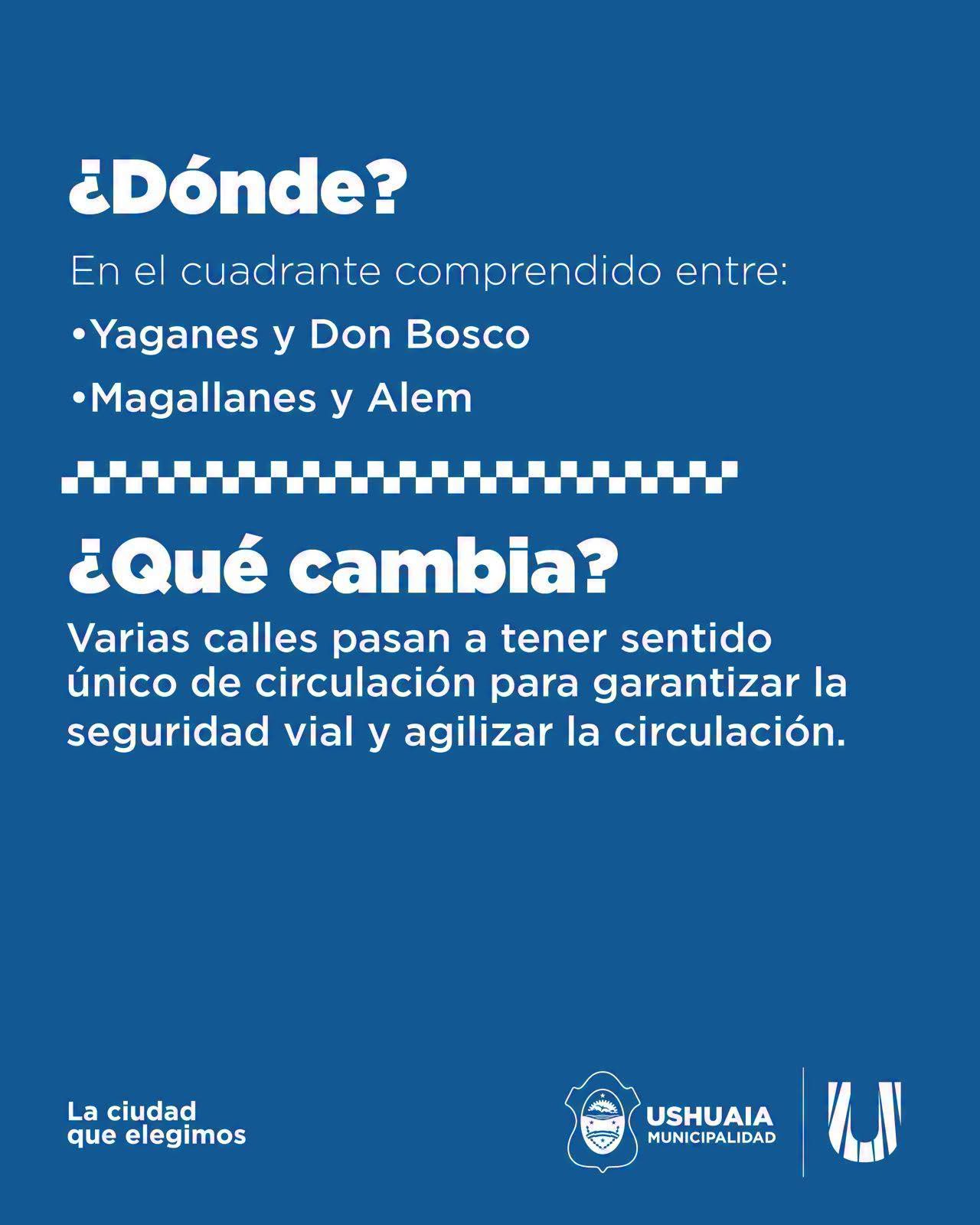 La Municipalidad de Ushuaia informa que, a partir del 27 de abril, entrarán en vigencia nuevos sentidos de circulación vehicular en un amplio sector de la ciudad.