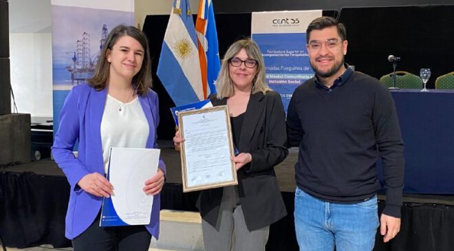 En este sentido el concejal Bogado hizo entrega de una placa en concepto de distinción a las coordinadoras de la carrera Tecnicatura Superior en Acompañamiento Terapéutico del Cent 35, Antonela Rossi, coordinadora académica y Natalia Mallemaci, coordinadora de prácticas profesionalizantes.