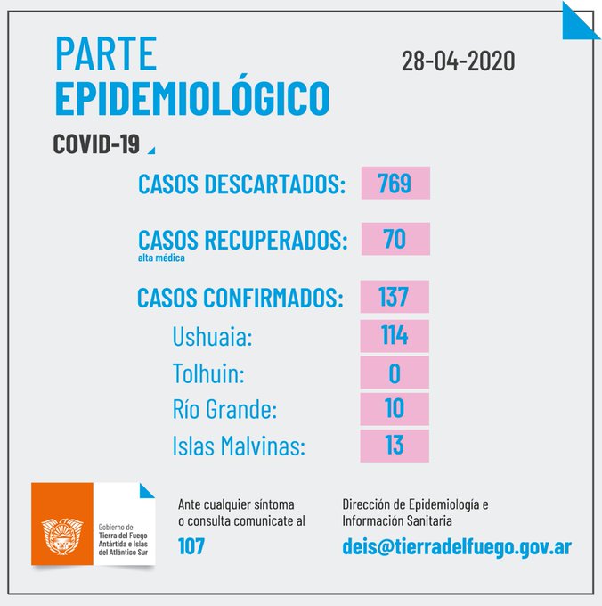 #Coronavirus COVID-19 Hoy Tierra del Fuego tiene 54 infectados DestacadaNovedades By Super User On Abr 29, 2020 Share FacebookTwitterGoogle+WhatsAppEmail El total es de Tierra del Fuego 137 casosUshuaia 114 casos Rio Grande 10 casos Tolhuin 0 casos Malvinas 13 casos 60 pacientes recuperados en Ushuaia y 10 en Río Grande. Share FacebookTwitterGoogle+WhatsAppEmail