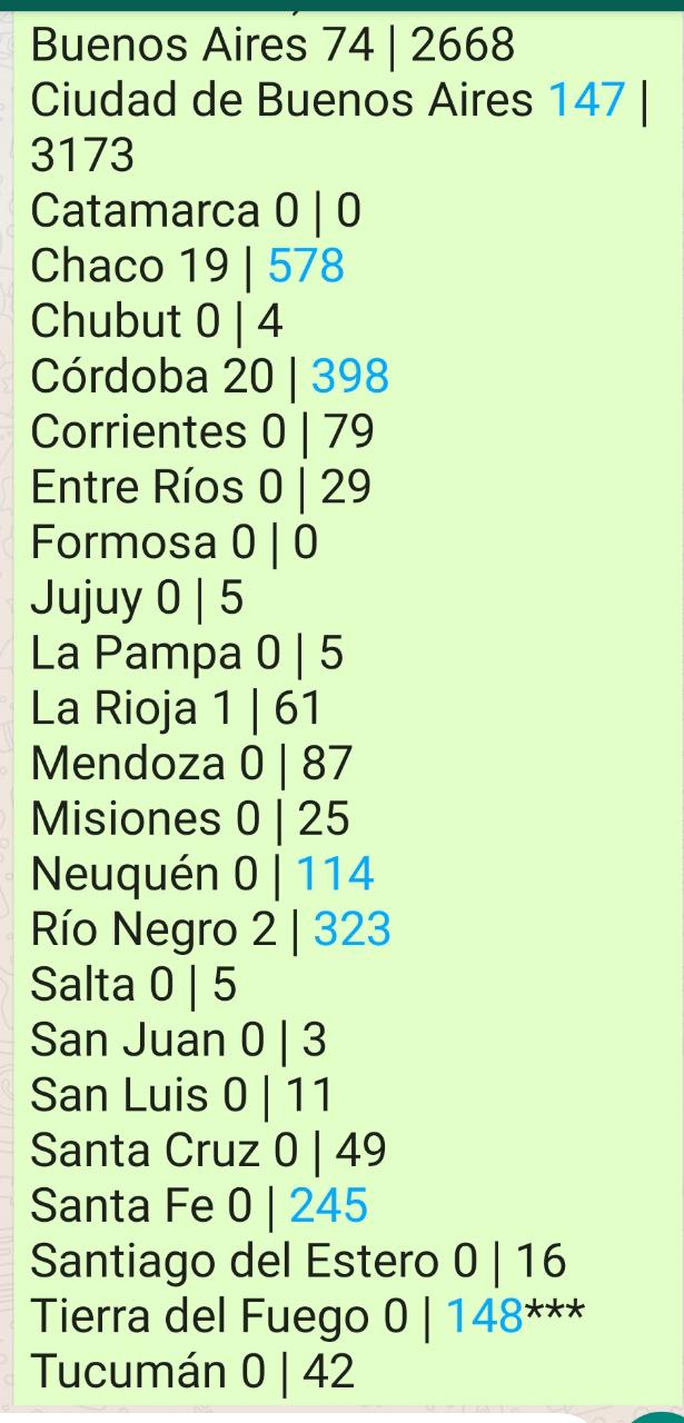 *Se incluyen, hasta el momento, 13 casos totales existentes en las Islas Malvinas. (debido a la ocupación ilegal del Reino Unido de Gran Bretaña e Irlanda del Norte no es posible contar con información propia sobre el impacto del COVID -19 en esa parte del territorio argentino).