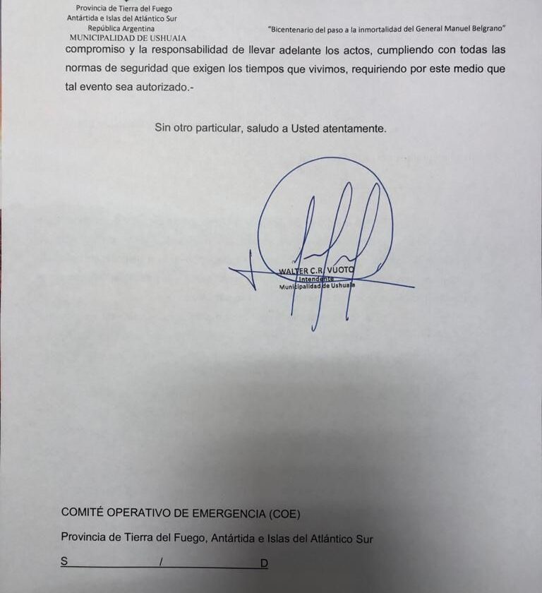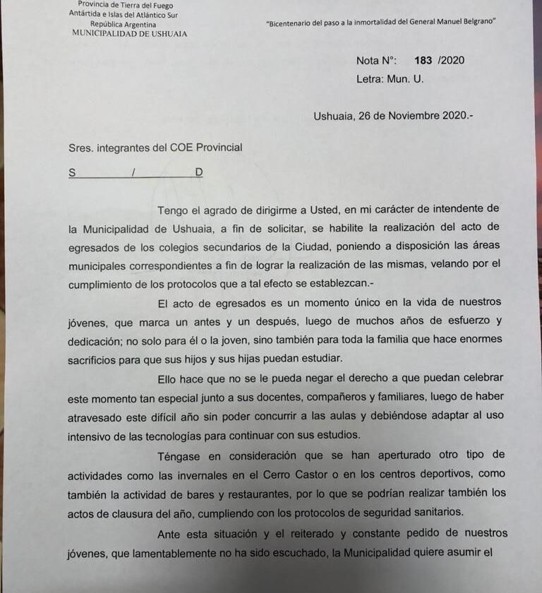 “Así como se han aperturado otro tipo de actividades como las actividades invernales en el Cerro Castor o en los centros deportivos, se podría realizar también los actos de clausura del año, cumpliendo con los protocolos de seguridad sanitarios” señala la nota que fue presentada esta mañana a la provincia.