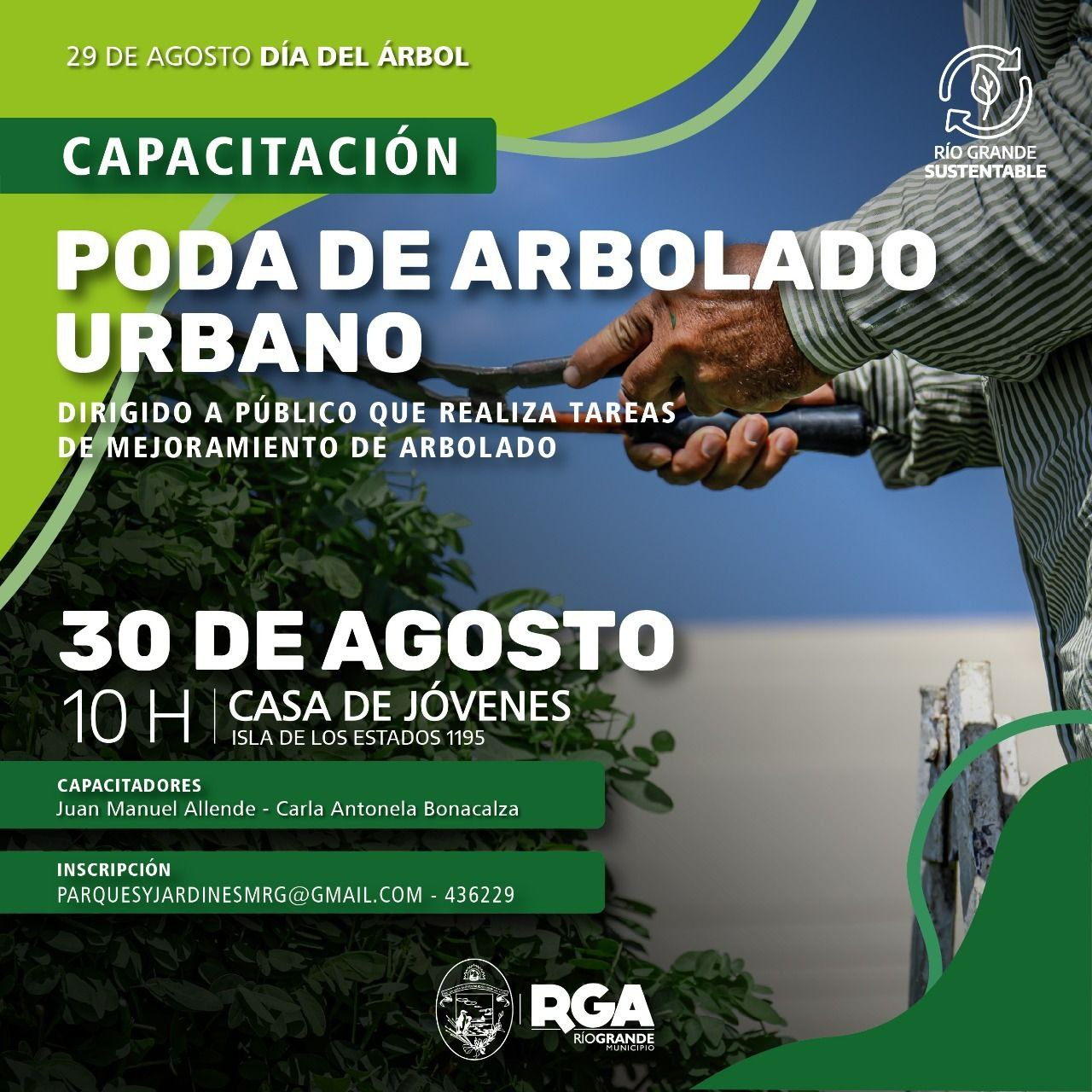 En el marco del Día del Árbol que se celebra cada 29 de agosto, el Municipio de Río Grande informa a vecinos y vecinas que se realizará una capacitación de “Poda de Arbolado Urbano” en espacios públicos.