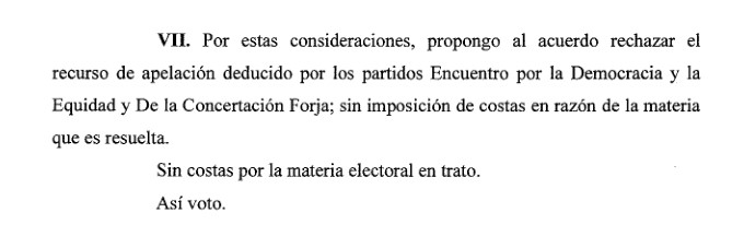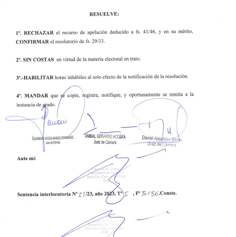 La sentencia firmada en un escrito de 14 páginas donde se enumeran todas las razones por la cual se rechaza el recurso de apelación presentado por los partidos políticos Encuentro por la Democracia y la Equidad y Partido de la Concertación Forja fue firmada hoy. Ambos partidos habían solicitado que se revoque una resolución emitida por el Juzgado Electoral que declaró la inadmisibilidad de las listas espejo como práctica electoral en las elecciones de este año.