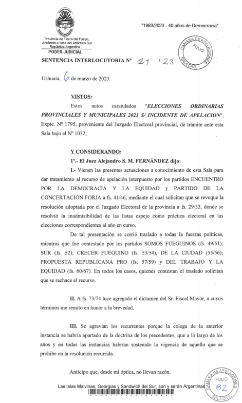 Los jueces Alejandro Fernandez, Anibal Gerardo Acosta y Daniel Alejandro Sacks en un escrito de 14 páginas delimitaron el rechazo hacia la interpelación por parte de partidos políticos en Tierra del Fuego hacia la formación de listas espejo.