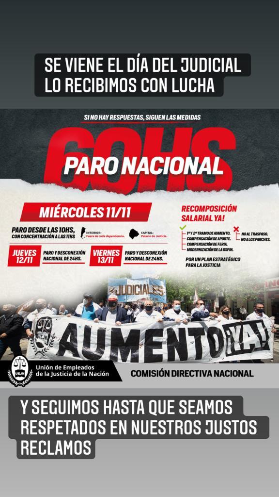 «En la ciudad de Ushuaia concentran en el Juzgado Federal de Primera Instancia y en la ciudad de Río Grande en Juzgado Federal y Fiscalía los días 12 -11 y 13 -11 Paro de 24 Hs y Desconexión», comentó Matías Pérez Delegado Nacional.-