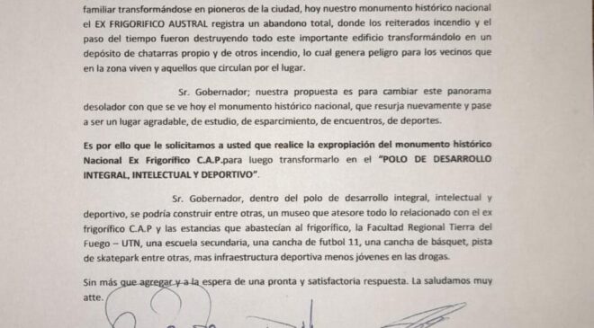 “Buscamos salvar a este monumento histórico nacional de la destrucción, hoy en un total estado de abandono, salvarlo y que resurja de sus cenizas para que se transforme en el ‘Polo de Desarrollo Integral, Intelectual y Deportivo’ de la ciudad y como primer medida entendemos que se deberá construir un importante museo que guarde todo aquello que se refiera a la época de brillo, de crecimiento, como fue cuando funcionaba este frigorífico y exportaba carne fueguina y contenía a cientos de trabajadores que luego se arraigaron”, agregó.