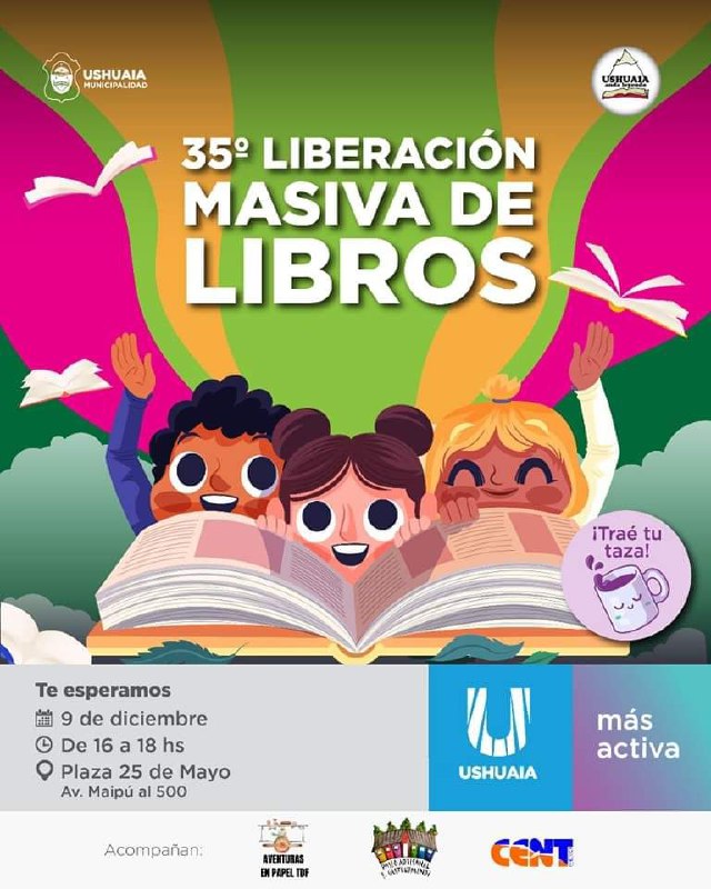 La Municipalidad de Ushuaia junto a la Asociación para el Fomento del Libro y la Lectura “Ushuaia anda Leyendo”, invita a los vecinos y vecinas a participar de la “35° Liberación Masiva de Libros por las calles de Ushuaia”, el próximo sábado 9 de diciembre en el horario de 16 a 18 horas.