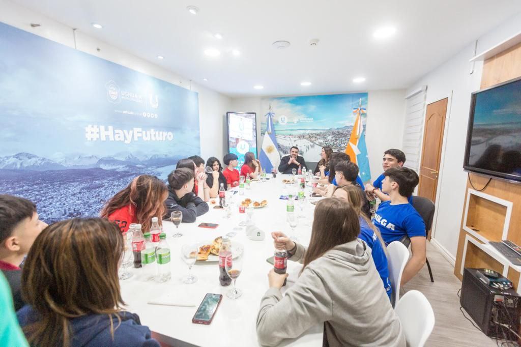 Las y los alumnos de los últimos años del colegio visitaron al intendente en uso de su licencia y a la secretaria de Cultura y Educación, donde dialogaron sobre las actividades propias de la competencia colegial, así como su participación en el programa municipal “Ushuaia Joven”.