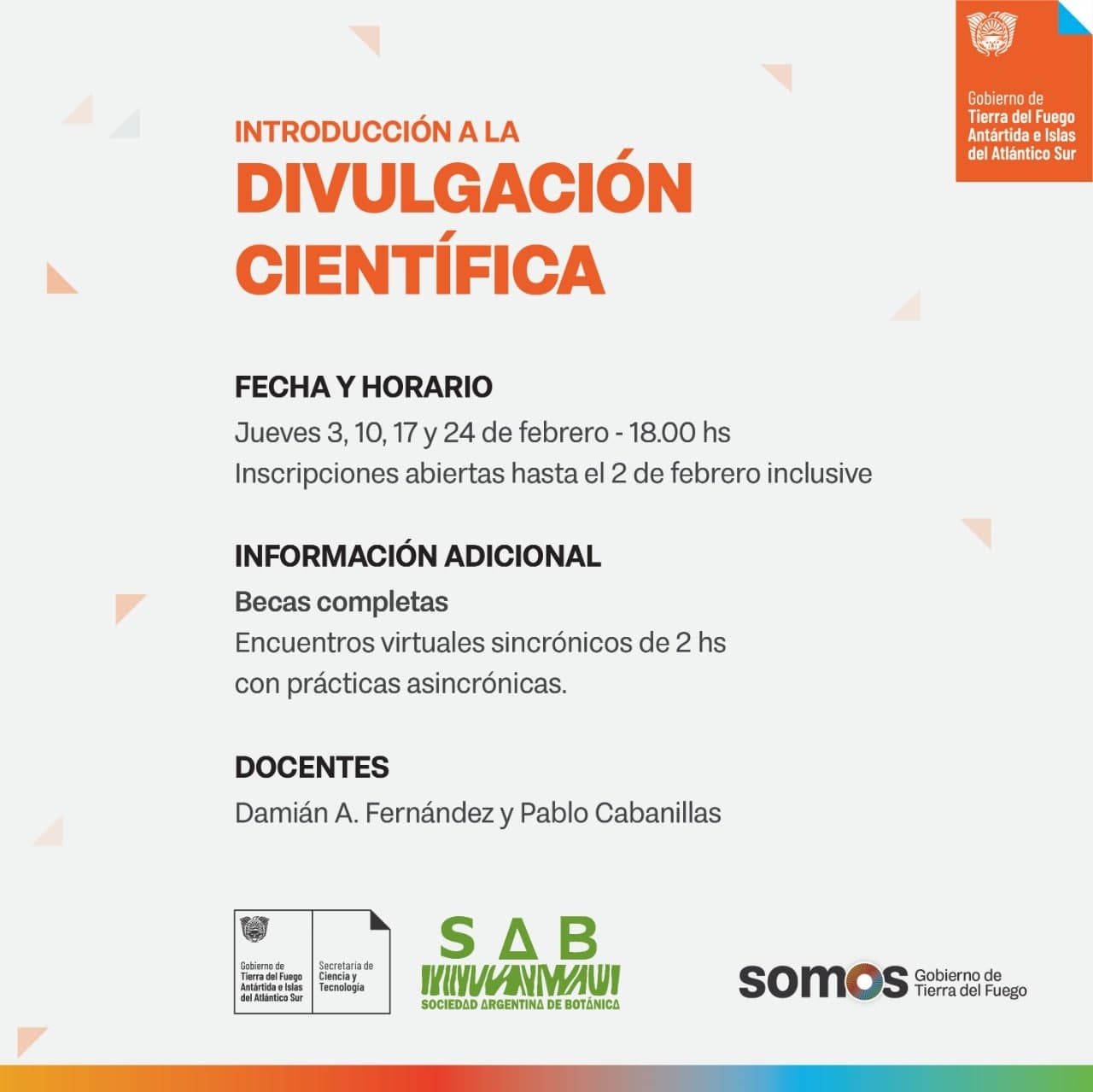 La Secretaría de Ciencia y Tecnología dependiente del Ministerio de Educación, Cultura, Ciencia y Tecnología otorgará becas para residentes fueguinos para realizar el curso “Introducción a la divulgación científica”. Este curso está organizado por la Sociedad Argentina de Botánica (SAB) y será impartido por docentes especializados en divulgación, promoción y popularización de las ciencias.