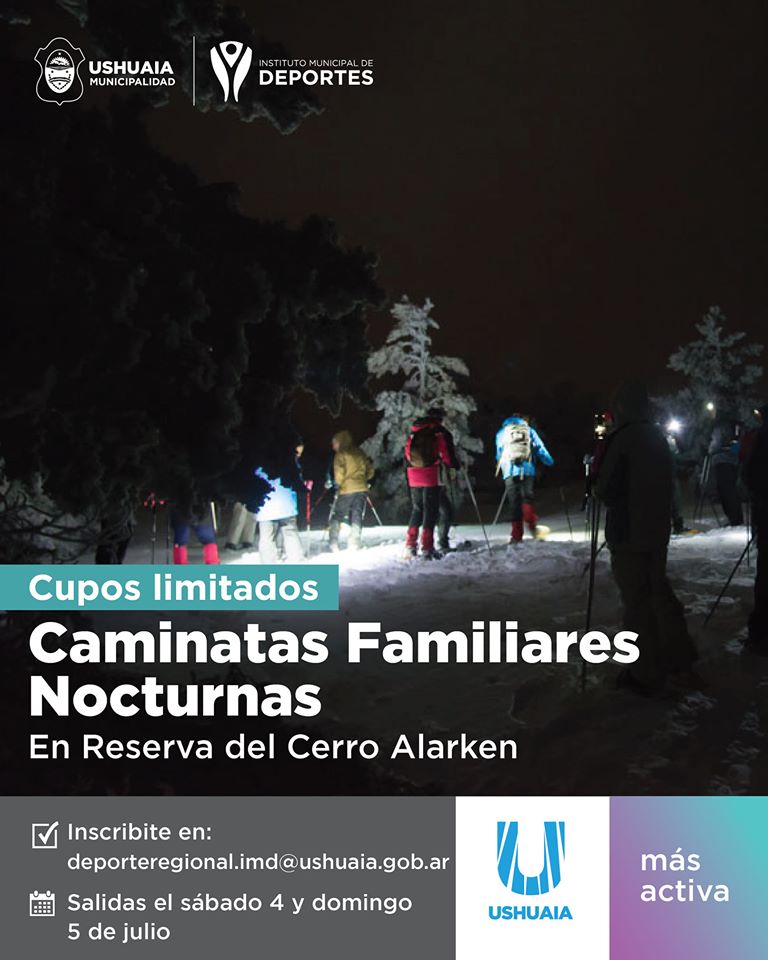 CUPOS LIMITADOS💻Inscripciones: deporteregional.imd@ushuaia.gob.arLugar de reunión: Estacionamiento camino al hotel ArakurDías y horarios:Grupo 1: sábado 4/07 de 18 a 20 Hs.Grupo 2: sábado 4/07 de 18:30 a 20:30 Hs.Grupo 3: sábado 4/07 de 19 a 21Hs.Grupo 4: domingo 5/07 de 18 a 20 Hs.Grupo 5: domingo 5/07 de 18:30 a 20:30 Hs.Grupo 6: domingo 5/07 de 19 a 21 Hs.