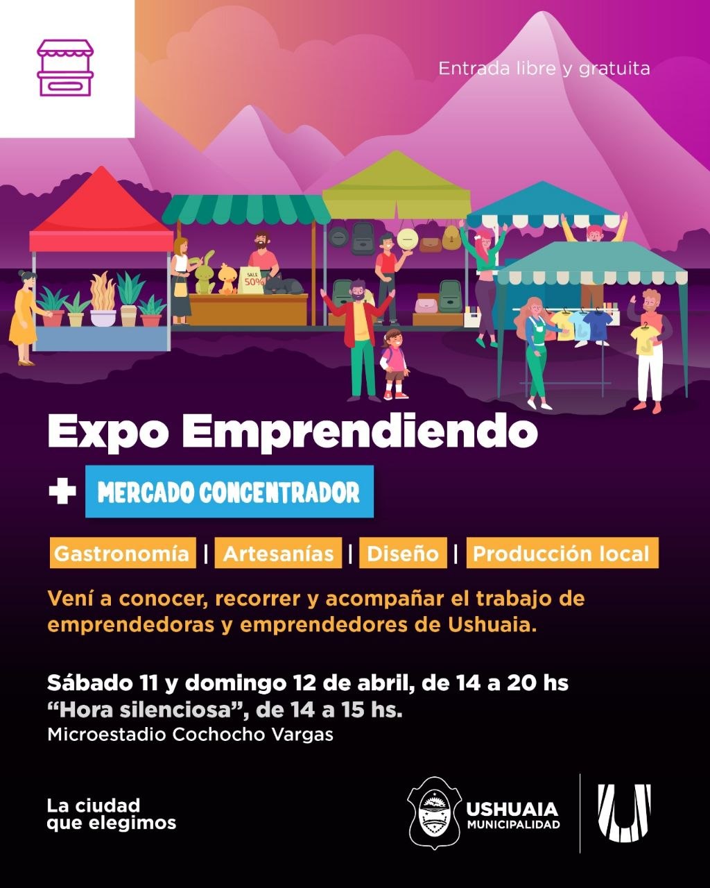 La Municipalidad de Ushuaia, a través de la Secretaría de la Mujer y Desarrollo Humano, y de la Secretaría de Economía y Finanzas; invita a vecinas y vecinos a participar de una nueva edición de la Expo Emprendiendo, que se llevará adelante junto al Mercado Concentrador los días sábado 11 y domingo 12 de abril, de 14 a 20 horas, en el Microestadio Cochocho Vargas.