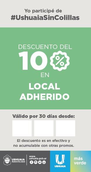 Munch (Bakery), Dali Café, La Marmita (Comidas Rápidas), Krund Ushuaia, Gélido (Hamburguesas y Panchos), Quinquela (Bar y Pizza), Café Banana, Van Gogh, La Estancia (Parrilla), Mundo Celular (Accesorios), Manhattan (Gourmet), El Greco (Grill y Wine), Windburguers (Paseo del Fuego), Munch South Ice Cream, todos estos comercios harán el 10% de descuento con pago en efectivo y no acumulable con otras promociones.