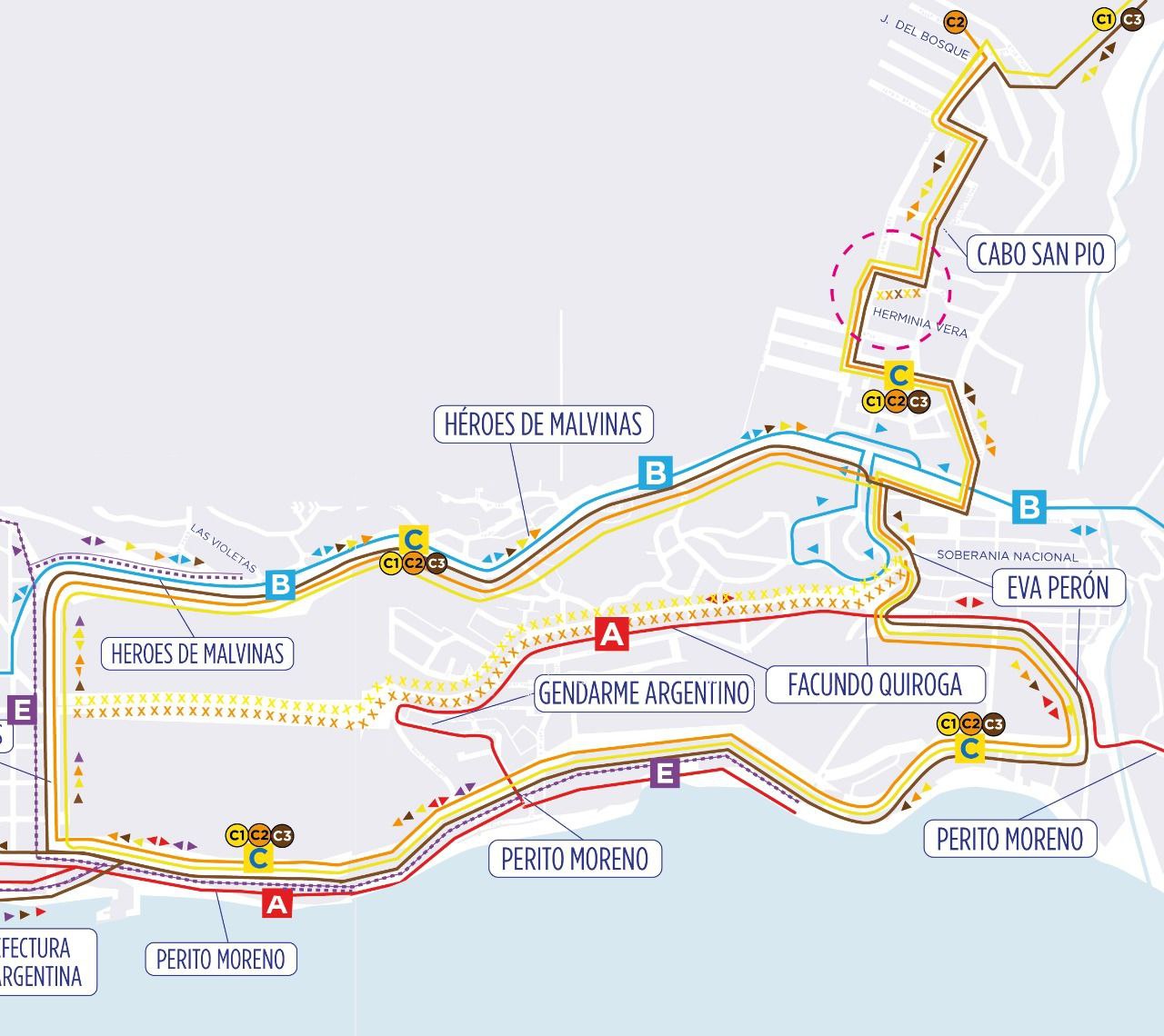 Para el caso específico de los ramales C1 (Las Reinas – Centro) y C2 (Antiguos Leñadores – Centro) las unidades que suben por calle Yaganes hasta la Av. Héroes de Malvinas, continuarán por esta arteria hasta tomar Teresa de Calcuta, en el barrio Los Morros, y seguir por Facundo Quiroga la ruta actual. Es decir, que los micros dejan de circular por Av. 44 Héroes del Submarino ARA San Juan.