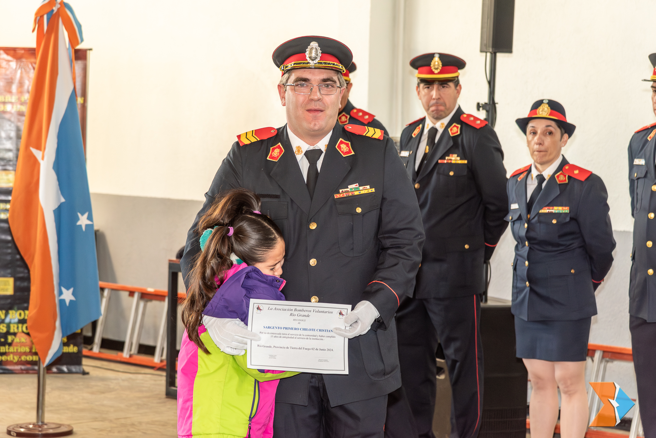 Con la presencia de la comisión directiva de Bomberos Voluntarios y su titular, Pascual Lombardo, durante el acto se hizo entrega de reconocimientos al personal que cumplió 15 años al servicio de la comunidad de Río Grande y, por parte de la Fuerza Aérea y de la Policía Provincial, las autoridades de la comisión directiva recibieron sendos presentes.