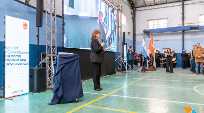 Ushuaia, lunes 3 de junio de 2024.- Por iniciativa del Gobierno provincial se realizó por primera vez, la ceremonia de jura de promesa de lealtad a la Constitución de Tierra del Fuego, Antártida e Islas del Atlántico Sur, de manera conjunta con alumnas y alumnos de establecimientos de educación pública y de gestión privada de la capital. La actividad, que se desarrolló en el gimnasio del Colegio Don Bosco, fue presidida por la vicegobernadora Mónica Urquiza quien fue acompañada por el ministro de Educación, lic. Pablo López Silva; el vicepresidente 1º de la Convención Constituyente (MC), Ruggero Preto y funcionarios provinciales.