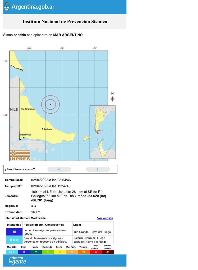El Gobierno de Tierra del Fuego AIAS y el Municipio de Río Grande informaron este domingo sobre un sismo de magnitud 4.3 en la escala de Mercali, que se produjo alrededor de las 8.45 de la mañana a 68 kilómetros de la costa de Río Grande. Afortunadamente, no hubo reportes de daños materiales ni personas heridas.