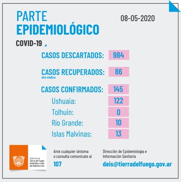 Covid-19: Totalidad de casos confirmados en Tierra del Fuego a la fecha 145 (*). No se registran nuevos casos en la provincia.