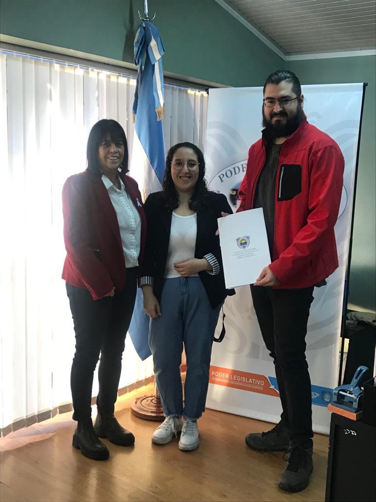 La Delegación Río Grande del Poder Legislativo fue escenario del encuentro de la legisladora Liliana Martínez Allende (UCR) con realizadores de la producción audiovisual fueguina “Verde Oliva”. La Parlamentaria, entregó la resolución legislativa que declara de interés de Tierra del Fuego, a la cinta que tienen como norte “profundizar la tarea de difusión de la Gesta de Malvinas”, dijo Martínez Allende.