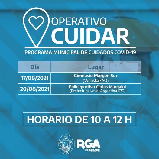 El Municipio de Río Grande, a través de las Secretarías de Salud y de Gestión Ciudadana, informa a los vecinos y vecinas los días, lugares y horarios en los cuales se desarrollarán los operativos de testeos voluntarios de Covid-19 en la semana del 16 al 20 de agosto.