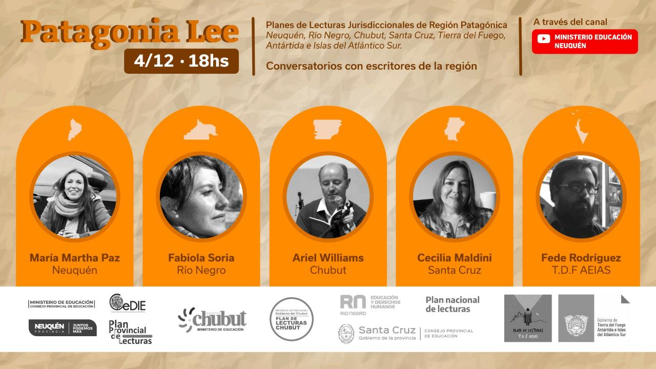 Desde el Plan de Lectura del Ministerio de Educación, Cultura, Ciencia y Tecnología de la provincia de Tierra del Fuego AeIAS, se informa que el próximo 4 de diciembre a las 18 horas se llevará a cabo el primer encuentro con escritoras y escritores regionales en el marco del “Patagonia Lee”, un proyecto organizado en forma conjunta por los Planes de Lecturas de las provincias de Neuquén, Río Negro, Chubut, Santa Cruz y Tierra del Fuego AeIAS. Está dirigido a docentes, personal de bibliotecas escolares y público en general.