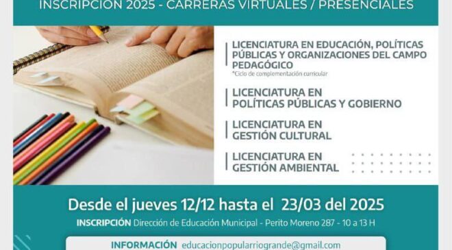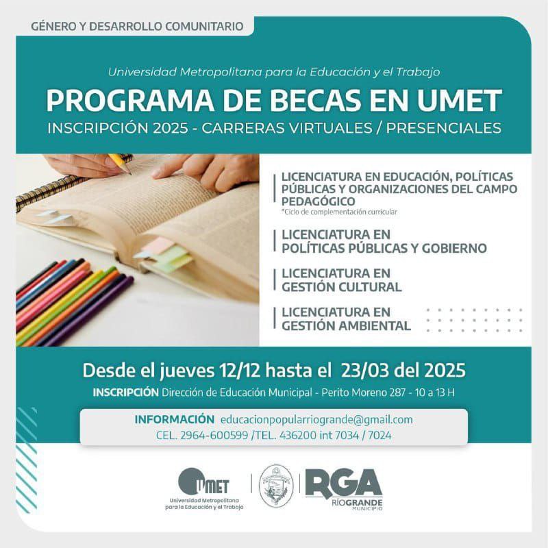 Gracias al convenio firmado entre el Municipio de Río Grande y la Universidad Metropolitana para la Educación y el Trabajo (UMET), vecinos y vecinas pueden acceder con un descuento a las carreras virtuales de: Lic. en Educación, Políticas Públicas y Organizaciones del Campo pedagógico (ciclo de complementación curricular); Lic. en Políticas Públicas y Gobierno; Lic. en Gestión Cultural y Tecnicatura en Gestión Ambiental.