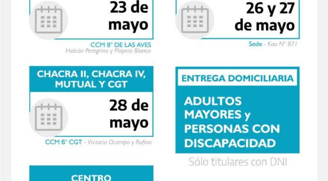 El viernes 23 de mayo la distribución será a las vecinas y vecinos que viven en el B° Malvinas Argentinas, Las Aves, Los Cisnes y Bicentenario, en el Centro Comunitario Municipal ubicado en Halcón Peregrino y Playero Blanco.