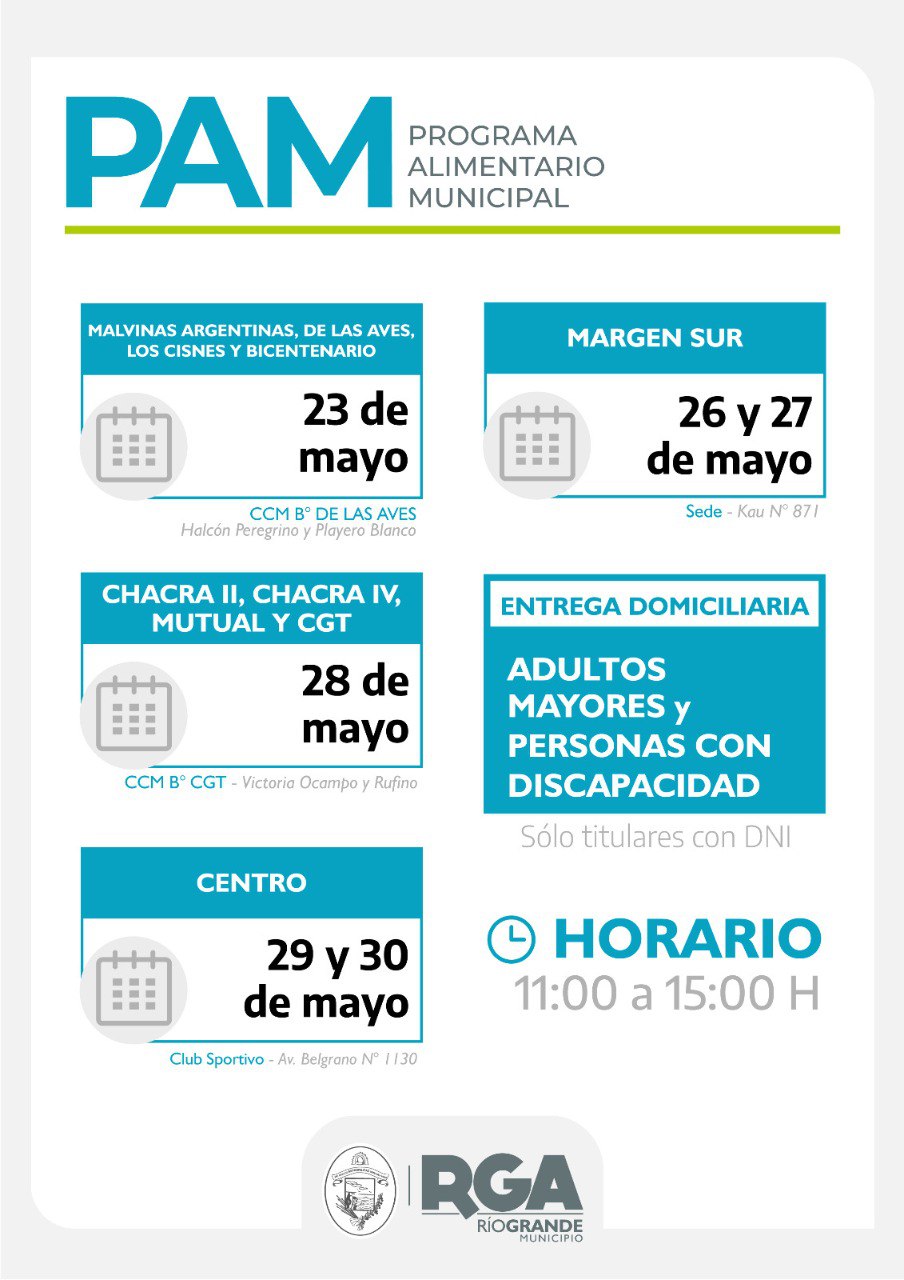 El Municipio de Río Grande informa a la comunidad que este viernes 23 de mayo comenzará la distribución de los módulos alimentarios a las vecinas y vecinos de diferentes puntos de la ciudad que están empadronados en el Programa.