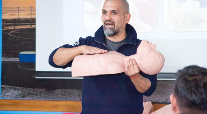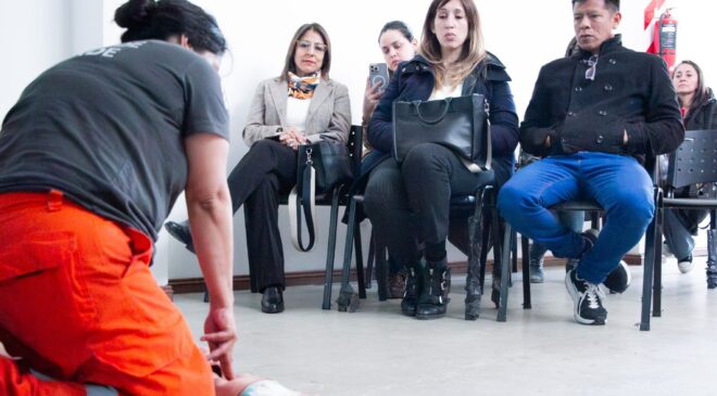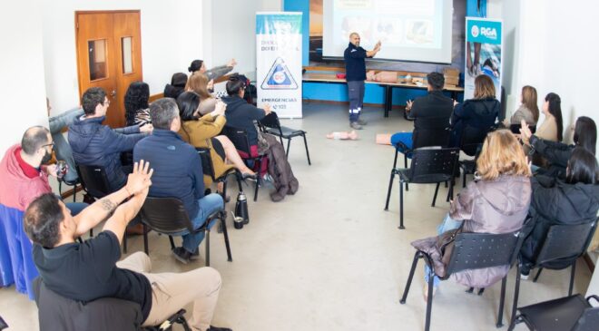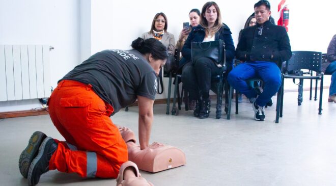 Durante la jornada, las y los trabajadores se capacitaron en temas clave como la activación de números de emergencia, técnicas de RCP, compresiones torácicas, uso del desfibrilador externo automático (DEA) y primeros auxilios generales. Además, se realizaron prácticas para afianzar los conocimientos adquiridos y brindar herramientas concretas que permitan actuar con eficacia ante situaciones críticas.