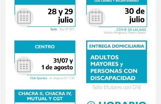 En tanto, el 31 de julio y el 1 de agosto, se entregarán los Módulos Alimentarios en el Club Sportivo, ubicado en Av. Belgrano 1130, para las familias de la zona céntrica.