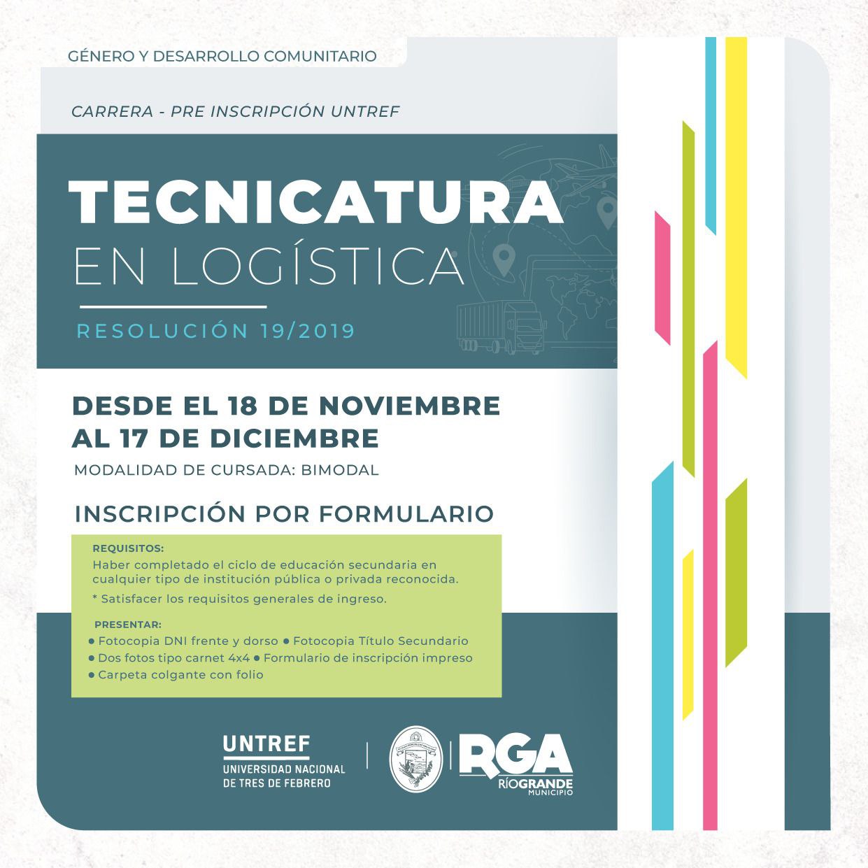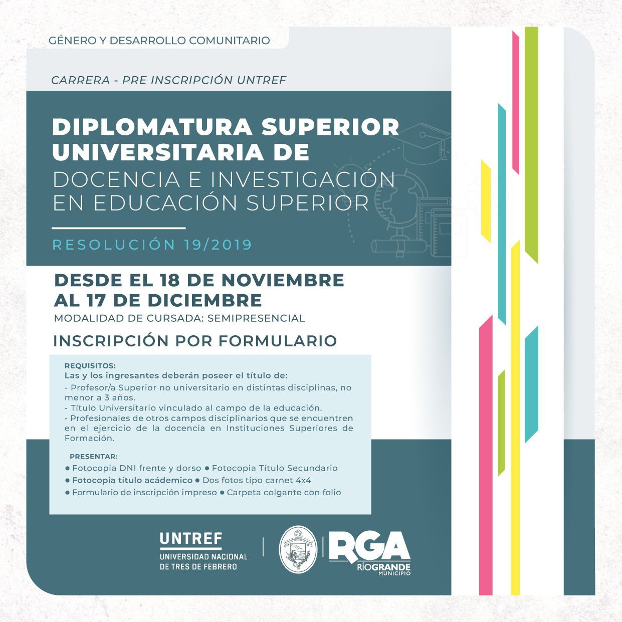 En el marco del convenio que el Municipio de Río Grande mantiene con la Universidad Nacional de Tres de Febrero (UNTREF), se pueden cursar en nuestra ciudad 2 instancias formativas: por un lado la Tecnicatura en Logística (resolución 19/2019) y la Diplomatura Superior Universitaria de Docencia e Investigación en Educación Superior (resolución 154-2023).