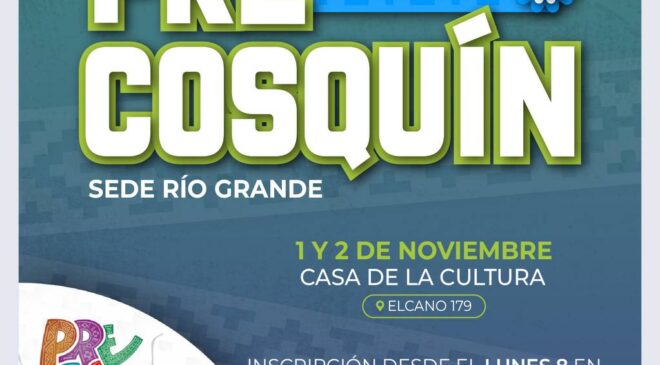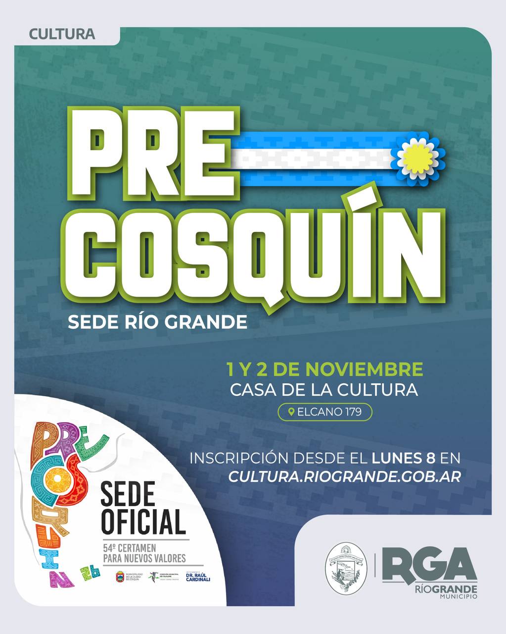 En una nueva edición del gran festival “Pre Cosquín 2026” en su 54° certamen para nuevos valores, el Municipio de Río Grande, a través de la Subsecretaría de Cultura, invita a los y las artistas del folklore de nuestra región a ser parte de la competencia que se llevará a cabo el próximo 1 y 2 de noviembre en nuestra Casa de la Cultura (Elcano 179).