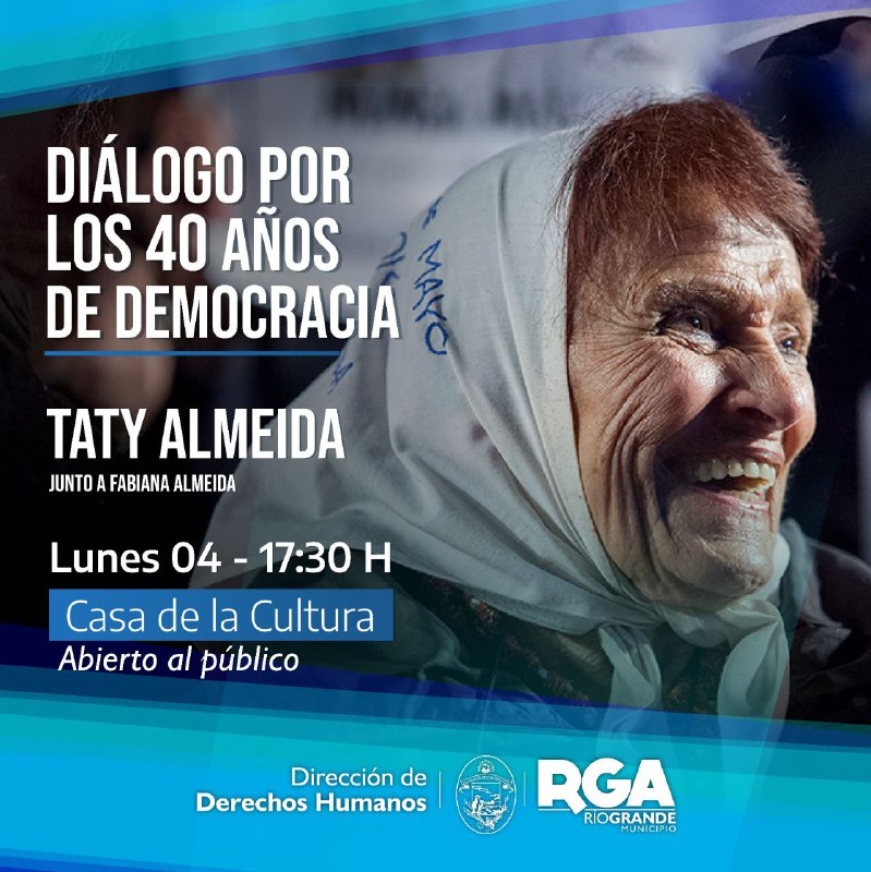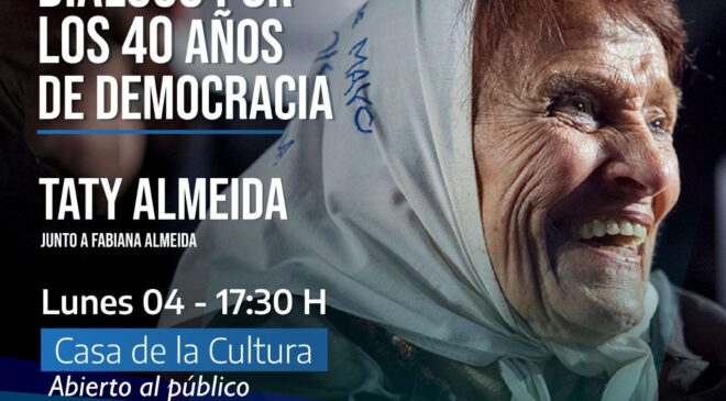 Nuestra ciudad recibirá a Lidia Stella Mercedes Miy Uranga, conocida por todos como “Taty” Almeida, miembro de Madres de Plaza de Mayo Línea Fundadora, quien brindará un “Diálogo por los 40 Años de Democracia”, este lunes 4 de septiembre en la Casa de la Cultura a las 17:30 horas.