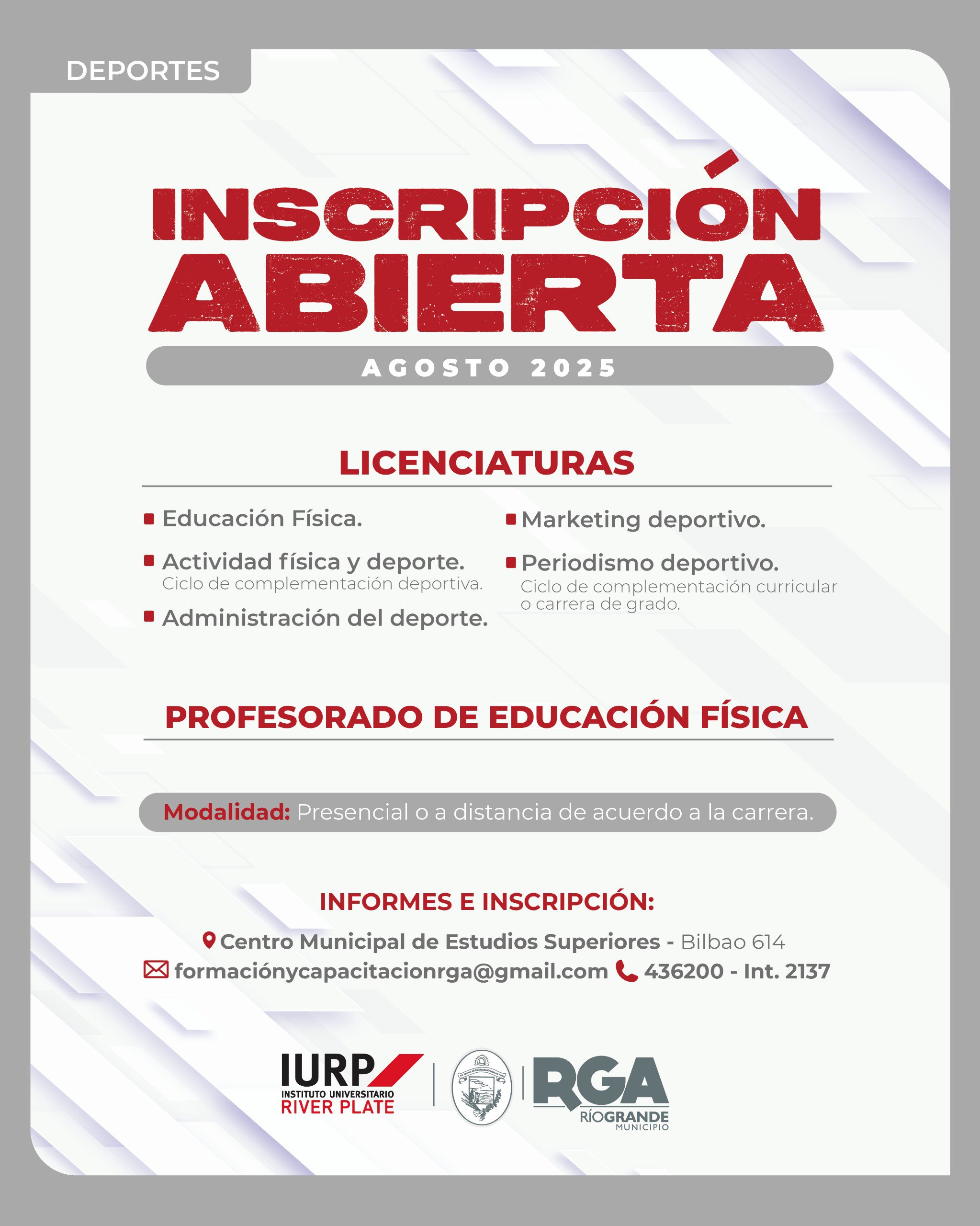 El Municipio de Río Grande, en conjunto con el Instituto Universitario River Plate (IURP), informa que se encuentran abiertas las inscripciones para iniciar en el mes de agosto el Profesorado de Educación Física.