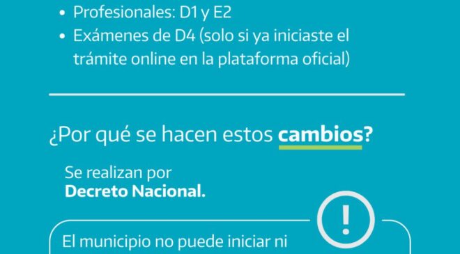 Esta decisión totalmente ajena al Municipio imposibilita que, desde los organismos municipales, se pueda gestionar o avanzar en cualquier trámite relacionado a renovar o adquirir las licencias de las categorías C, D y E, salvo las excepciones mencionadas.