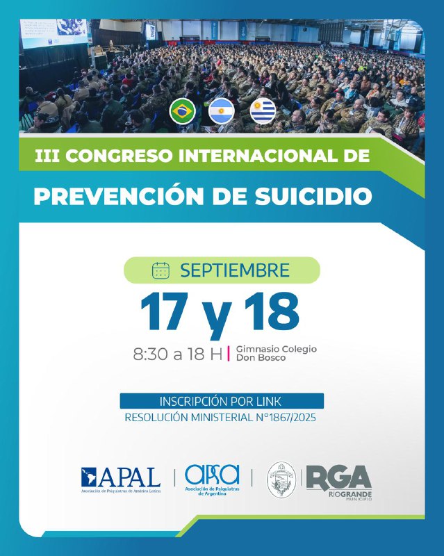 El Municipio de Río Grande, junto a la Asociación de Psiquiatras de América Latina (APAL) y la Asociación de Psiquiatras de Argentina (APSA), llevarán adelante el III Congreso Internacional de Prevención de Suicidio, que se desarrollará los días 17 y 18 de septiembre en el Gimnasio del Colegio Don Bosco. Para participar, las y los interesados deberán inscribirse previamente mediante el link: https://bit.ly/47iEtMn.