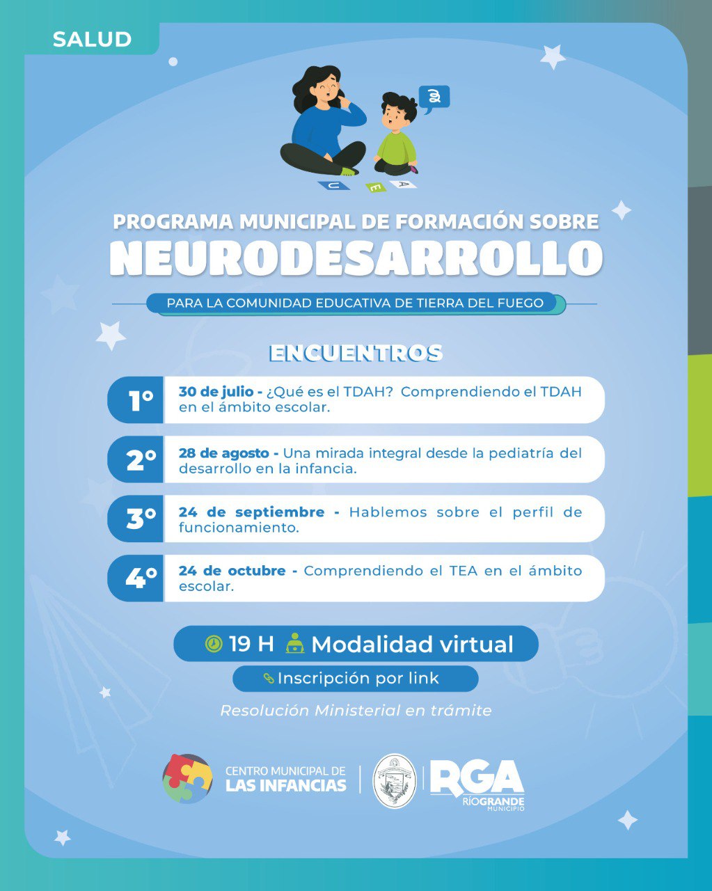 El Municipio de Río Grande, a través del Centro Municipal de las Infancias dependiente de la Secretaría de Salud, continúa con el Programa Municipal de Formación sobre Neurodesarrollo para la Comunidad Educativa. Esta propuesta tiene como objetivo fortalecer la capacitación en el abordaje integral del desarrollo infantil en el ámbito escolar y está dirigida a toda la provincia.