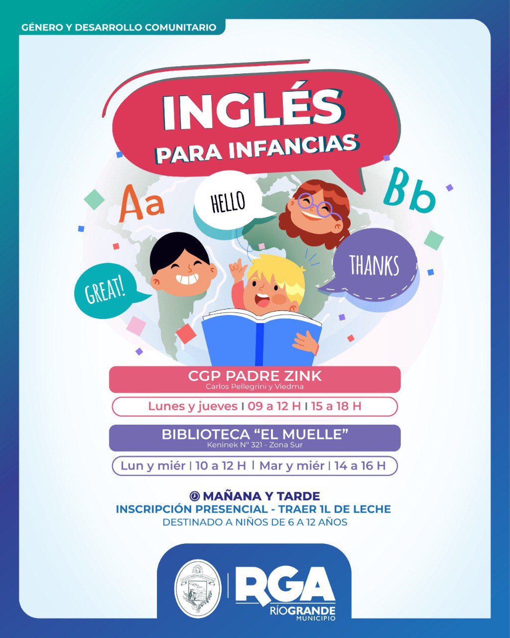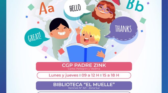 La Secretaría de Género y Desarrollo Comunitario invita a las niñas y niños riograndenses -desde 6 hasta los 12 años de edad- a participar de las clases de inglés. Las mismas se dictarán en el CGP Padre Zink y la Biblioteca «El Muelle», en los turnos mañana y tarde.