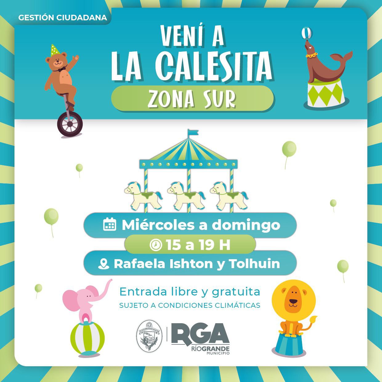 El Municipio de Río Grande recuerda a los vecinos y vecinas que está habilitada la Calesita de Zona Sur, ubicada en la intersección de las calles Tolhuin y Rafaela Ishton.