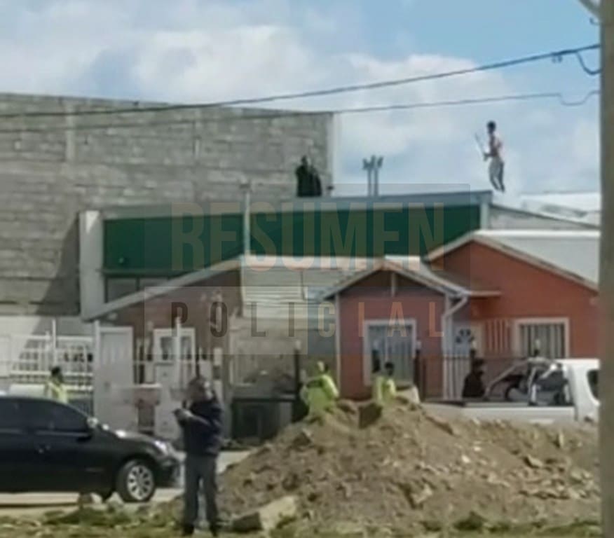 El extraño episodio sucedió esta mañana cuando el hombre de 33 años de forma exaltada discutió fuertemente con su grupo de amigos y vecinos de la zona llamaron a la policía que se hizo presente en la escena. El sospechoso se subió a un tejado y con un hierro invitaba a los policías a subirse al techo y pelear.