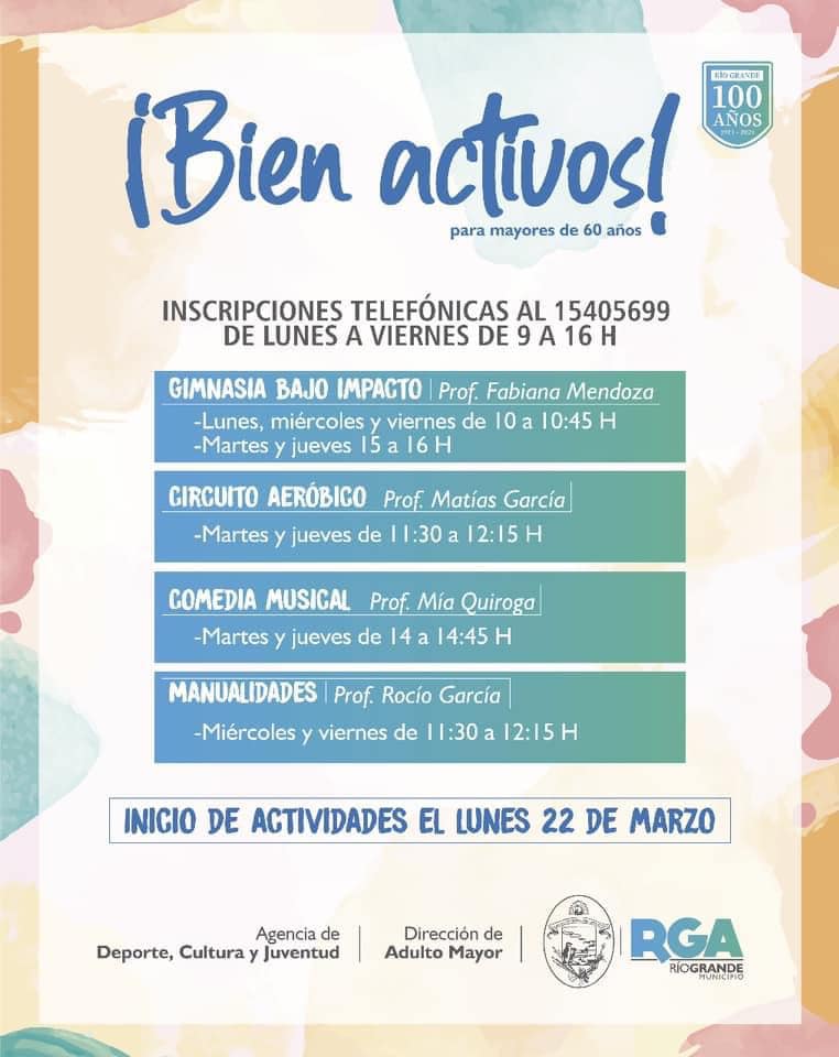 El Municipio de Río Grande, mediante la Dirección del Adulto Mayor, en conjunto con la Agencia Municipal de Deportes, Cultura y Juventud, pone a disposición a partir de este lunes 22 de marzo, actividades presenciales dirigidas a personas mayores de 60 años.