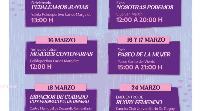 El 1° Encuentro de Rugby Femenino se realizará el 24 de marzo en la cancha del Club Universitario. Finalmente, las actividades concluirán el 26 con “Activas”, una charla para adultas mayores sobre cómo transitar la sexualidad. La misma se realizará en las instalaciones del Museo “Virginia Choquintel”.