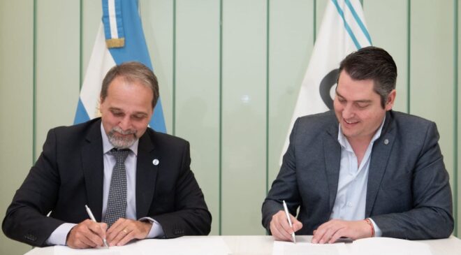 El intendente Martín Perez y el Director de la Organización de Estados Iberoamericanos (OEI) en Argentina, Luis Scasso, firmaron un convenio para comenzar una agenda de cooperación en materia de formación profesional y articulación público privada.