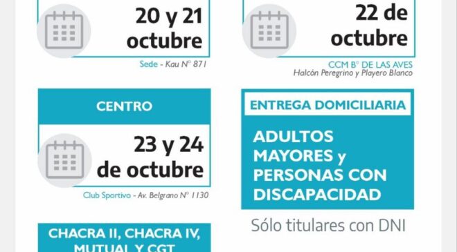 Finalmente el lunes 27 de octubre, la distribución será en la zona de Chacra II, Chacra IV, CGT y Mutual en el Centro Comunitario Municipal situado en Victoria Ocampo y Rufino.
